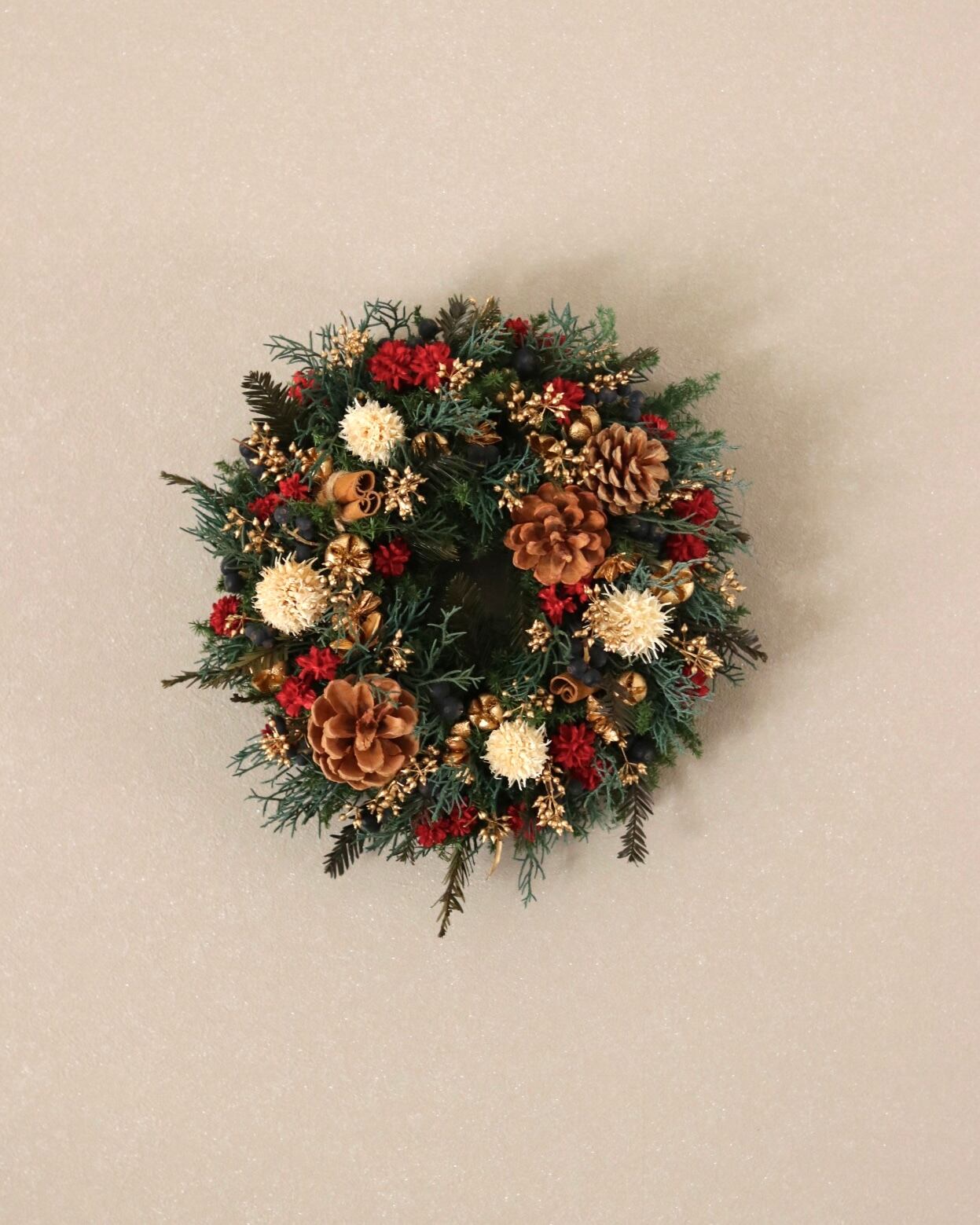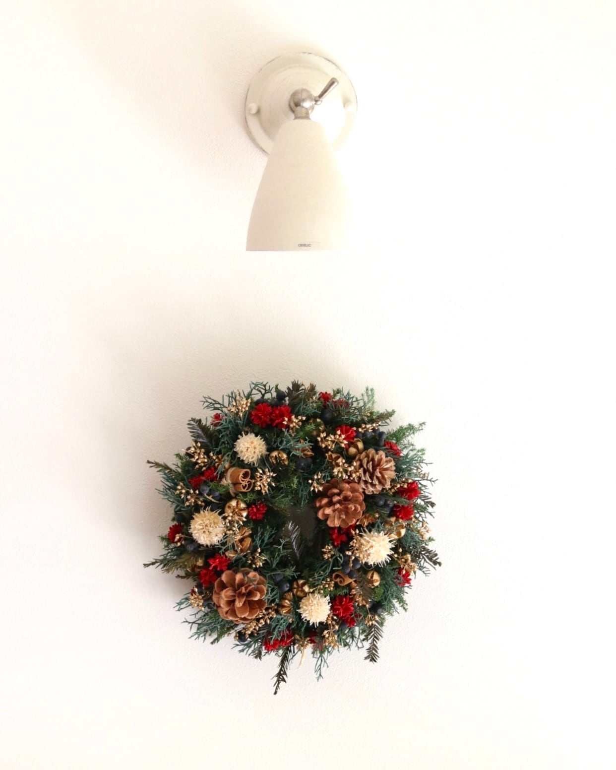 クリスマスカラーである赤と白を上品に取り入れた、大人なナチュラルリース。