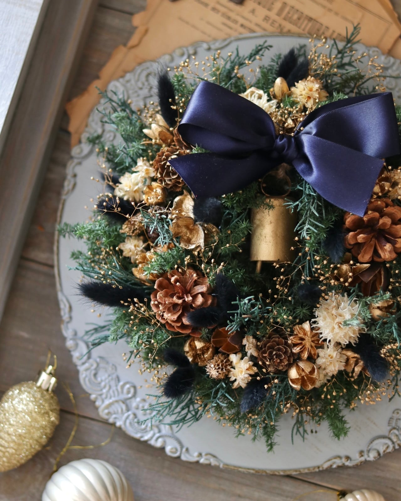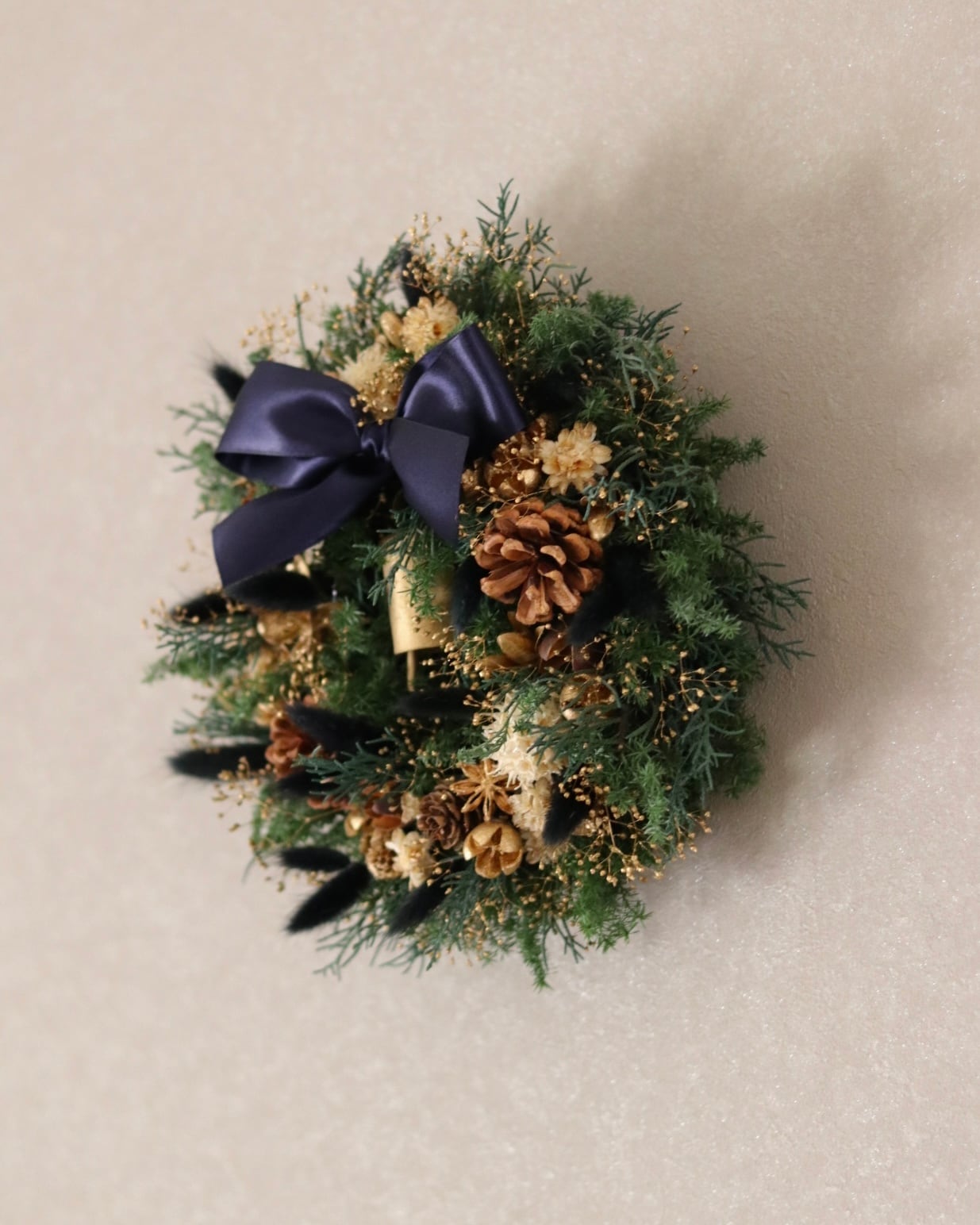 落ち着いたネイビーブルーのリボンと、中央に揺れるカウベルが可愛いリース。