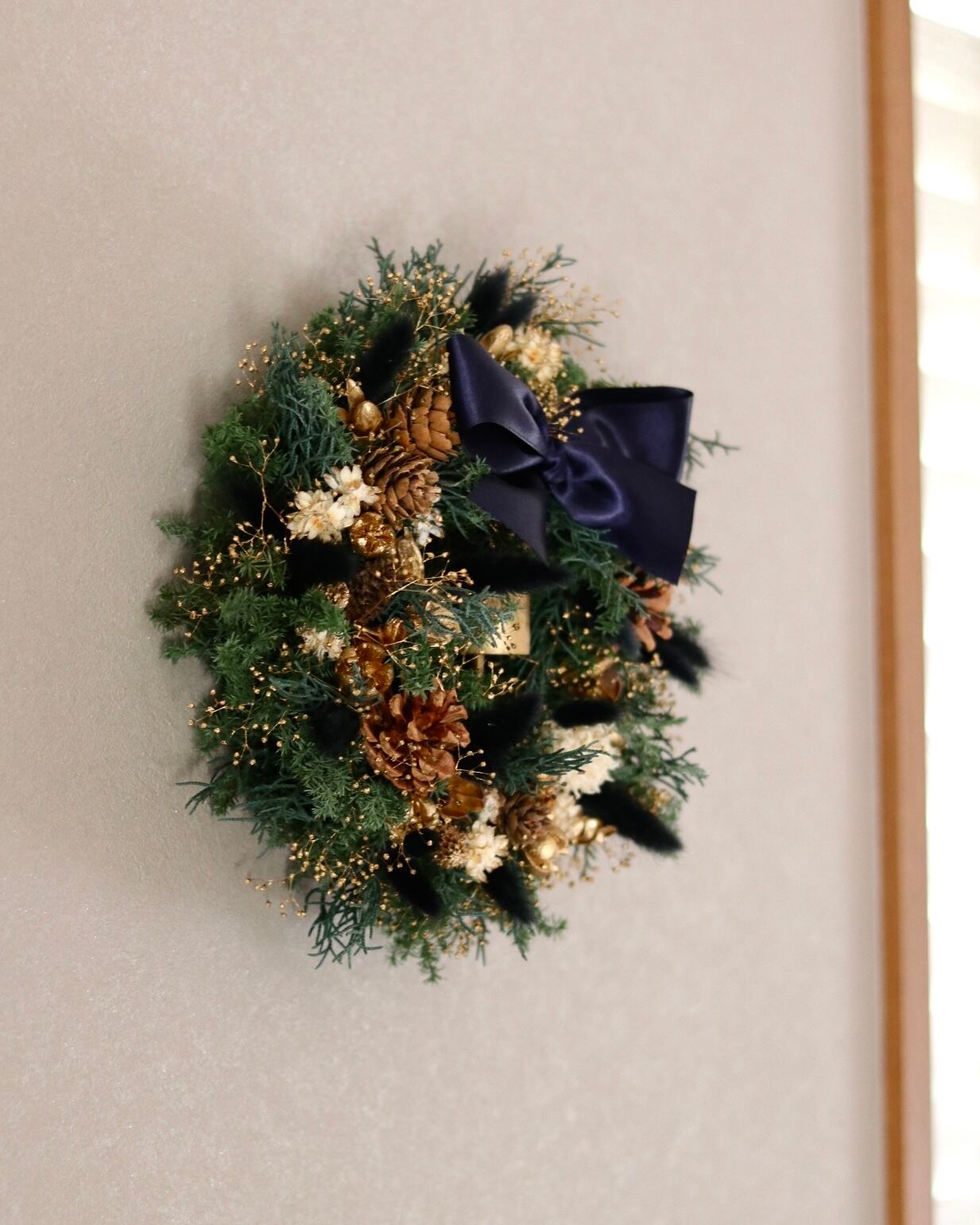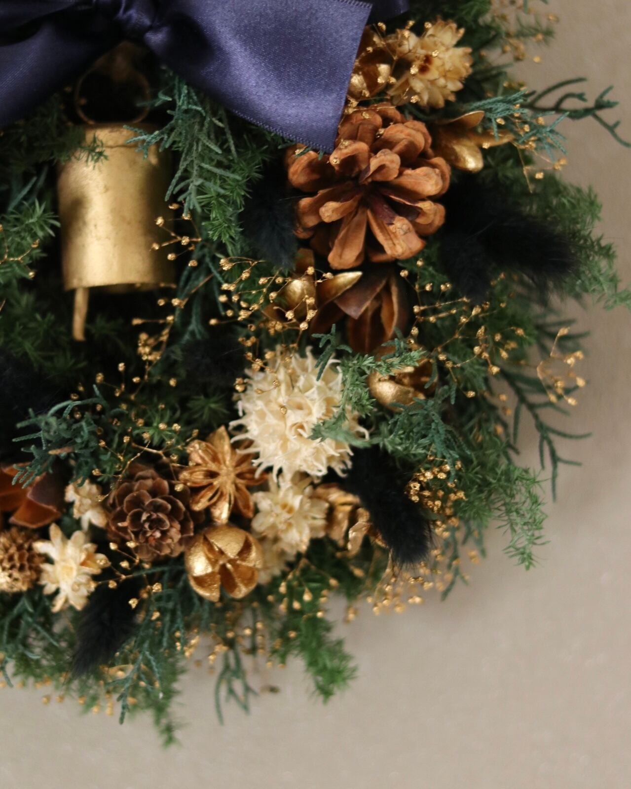 ゴールドで華やかさを加え、カジュアルになりすぎないシックなクリスマスリースです。