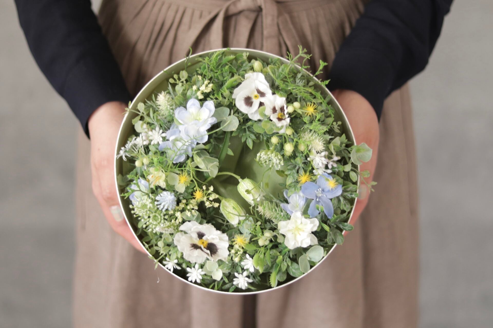 白いパンジーがアクセントの、さわやかな色合いのリース。シンプルな色合いですので、長くお楽しみいただけます。