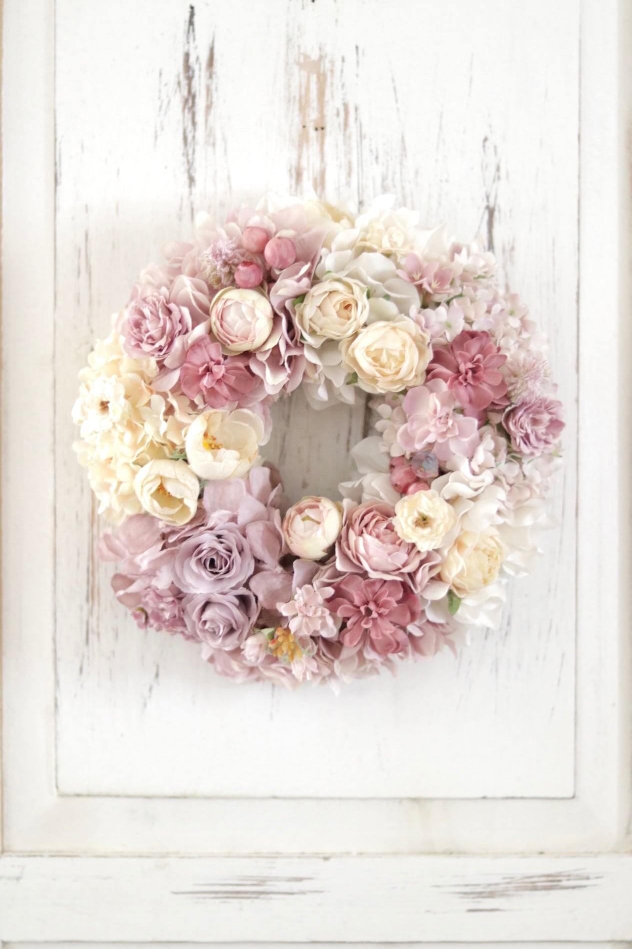 やわらかいくすみカラーのお花をたっぷり使ったリース。
