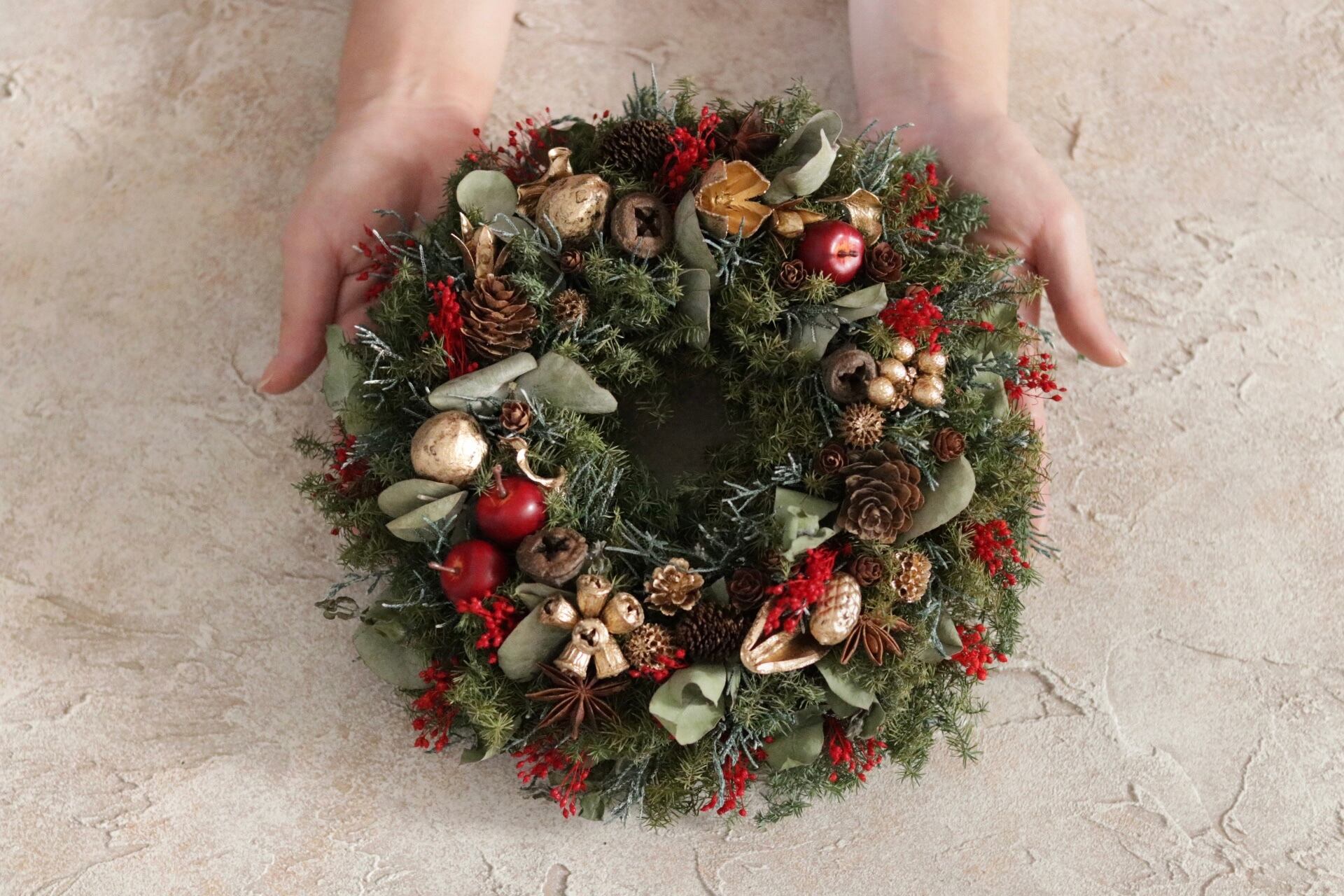 アンティークゴールドの木の実を使用したクラシカルなデザインのクリスマスリース。
