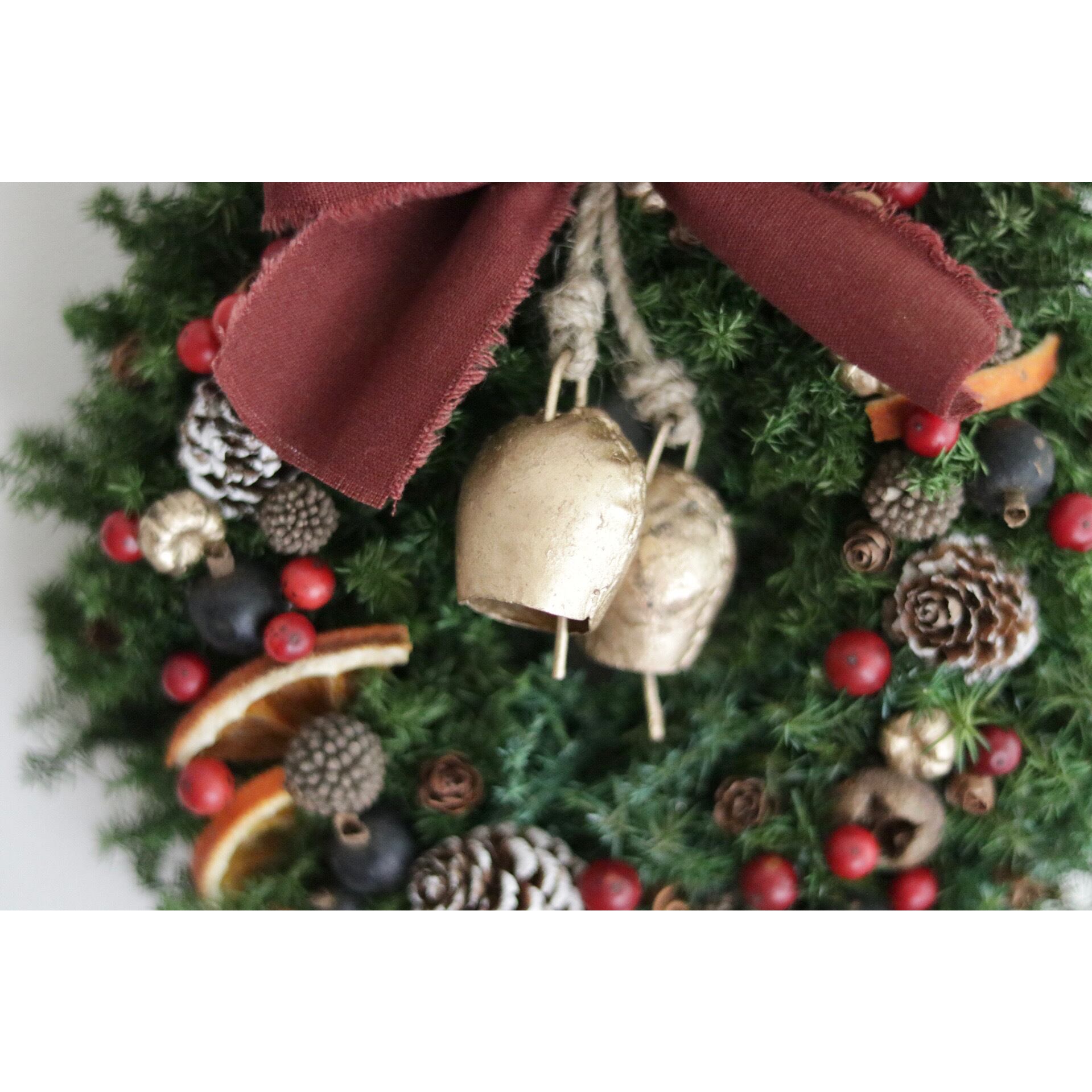 赤いリボンとカウベルがとてもかわいいクリスマスリース。
