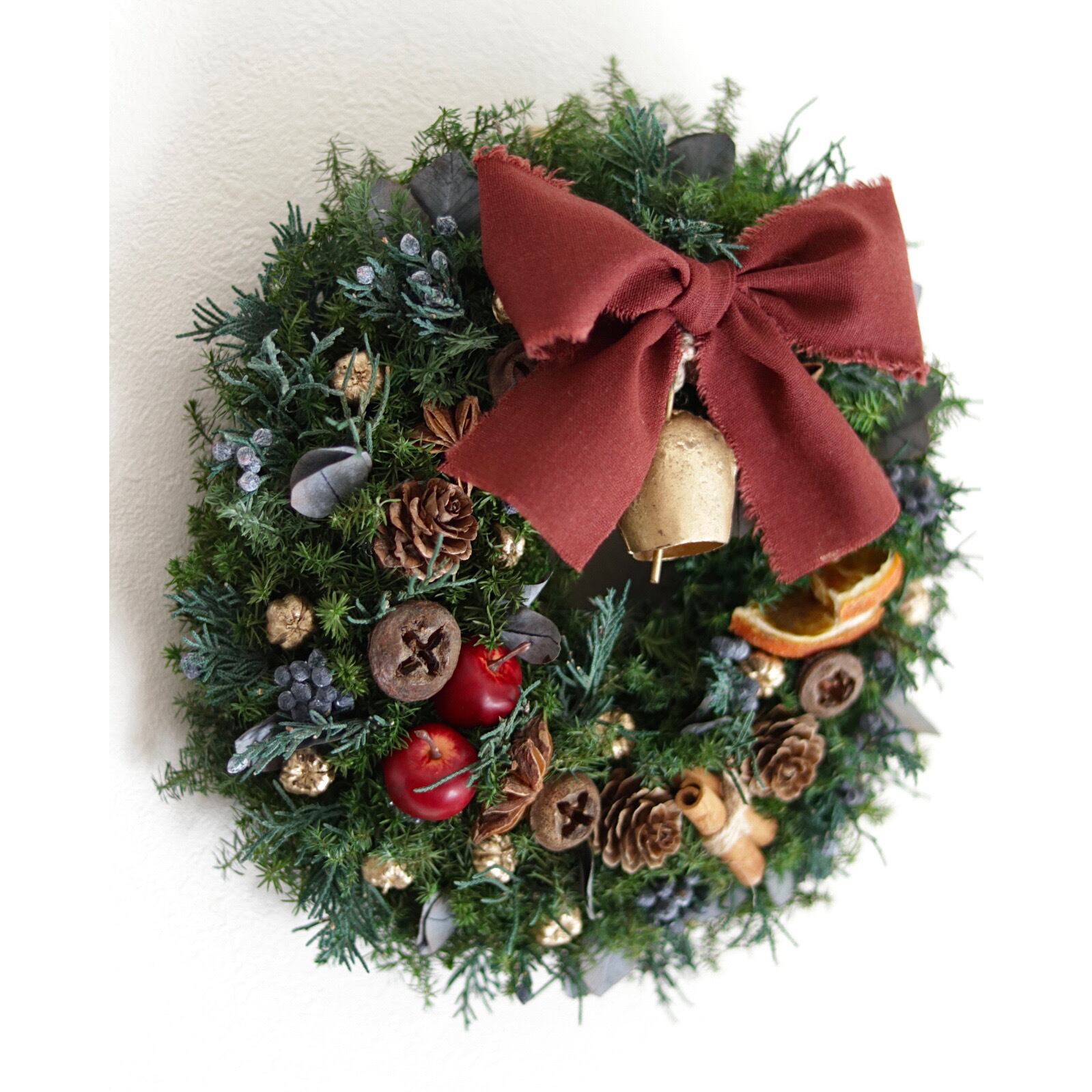 赤いリボンとカウベルがとてもかわいいクリスマスリース。
